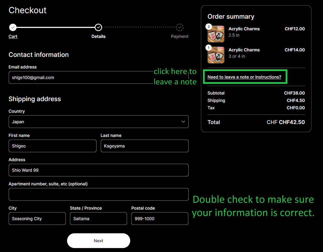 6. Enter your first name, last name, email, and address. Please write this in the Latin alphabet. Double check your information. If you want to add your phone number, write it in the notes.