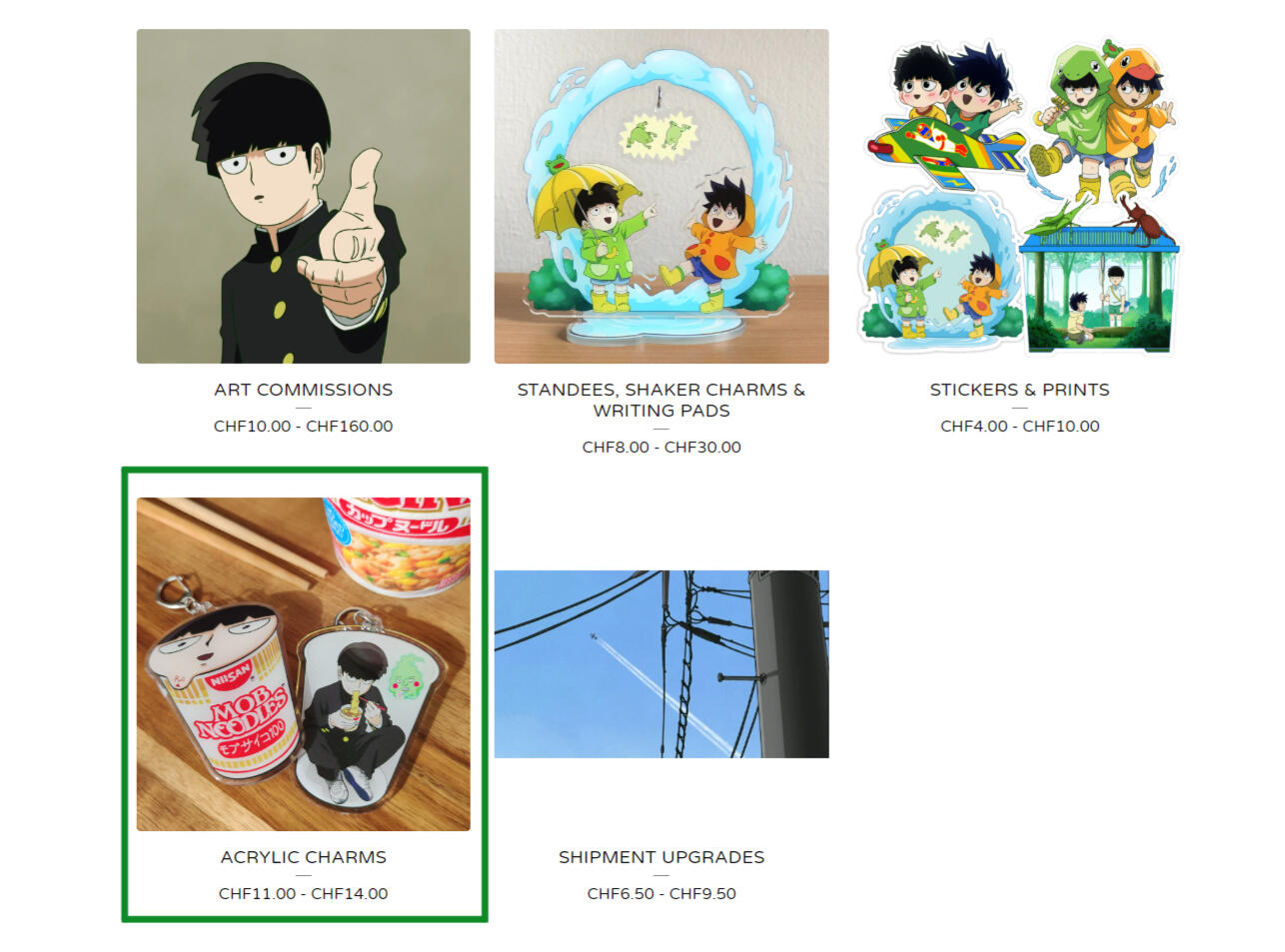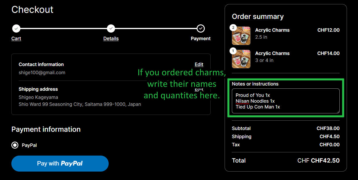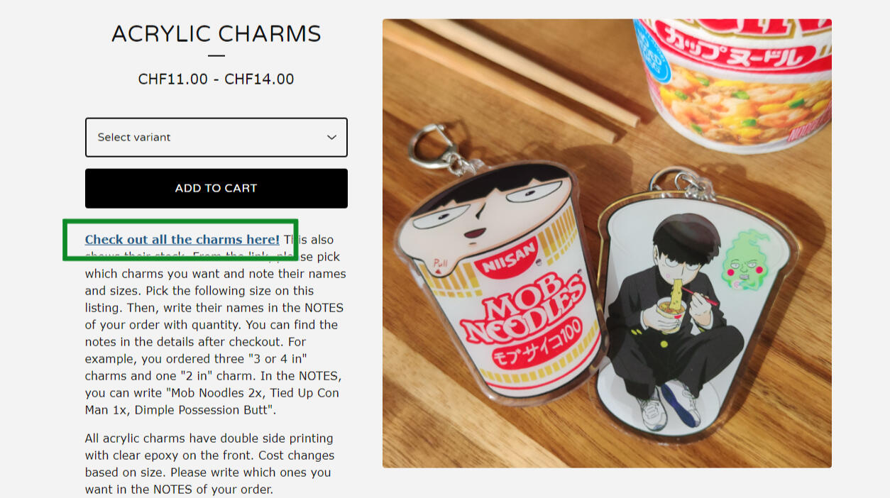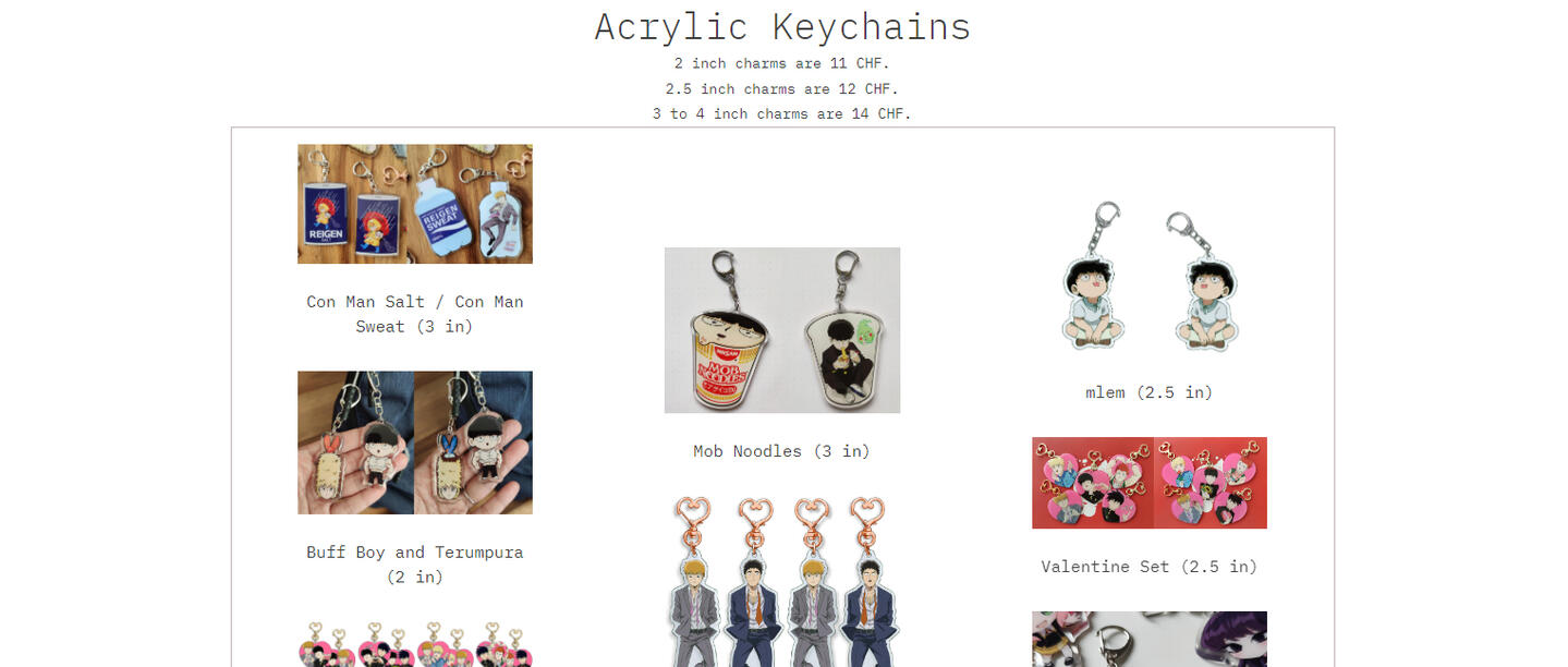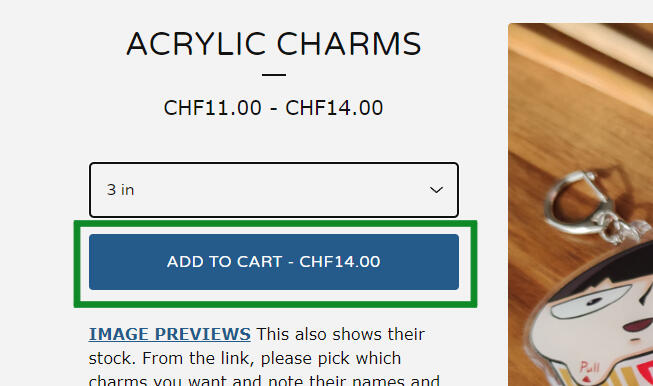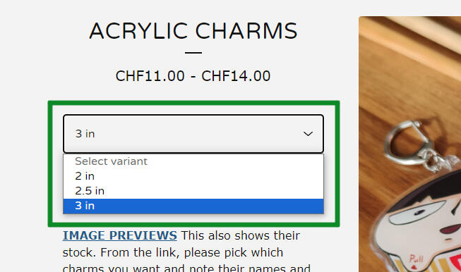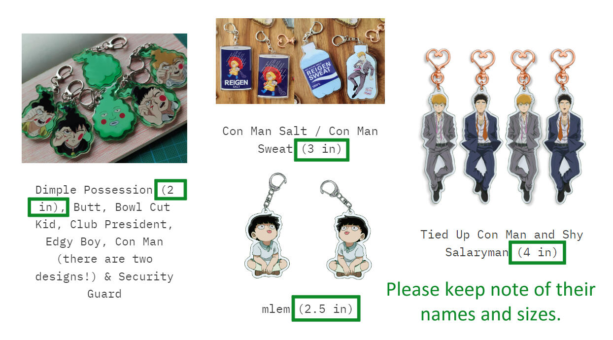 3. Please remember, or write down somewhere, the names and sizes of the charms you would like to get. NOTE: This is only for the keychains. The other goods are labeled in their listings.