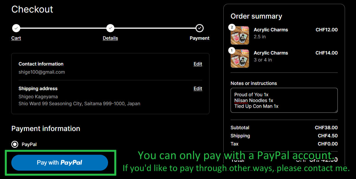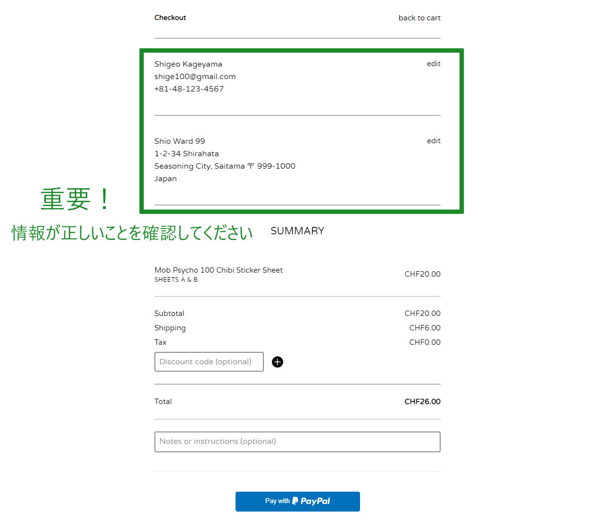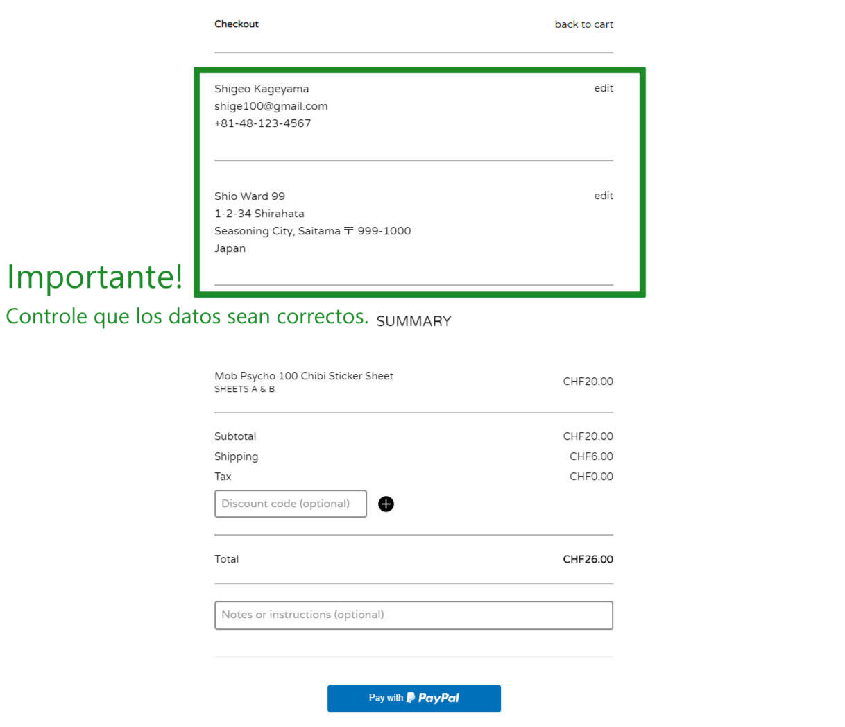 4. Introduzca su nombre y apellido, su correo electrónico, su número de teléfono y su dirección. Por favor elija el alfabeto latino. Controle sus datos para asegurar que todos los datos sean correctos. Si desea añadir alguna información, me puede dejar una nota en “notes or instructions”.