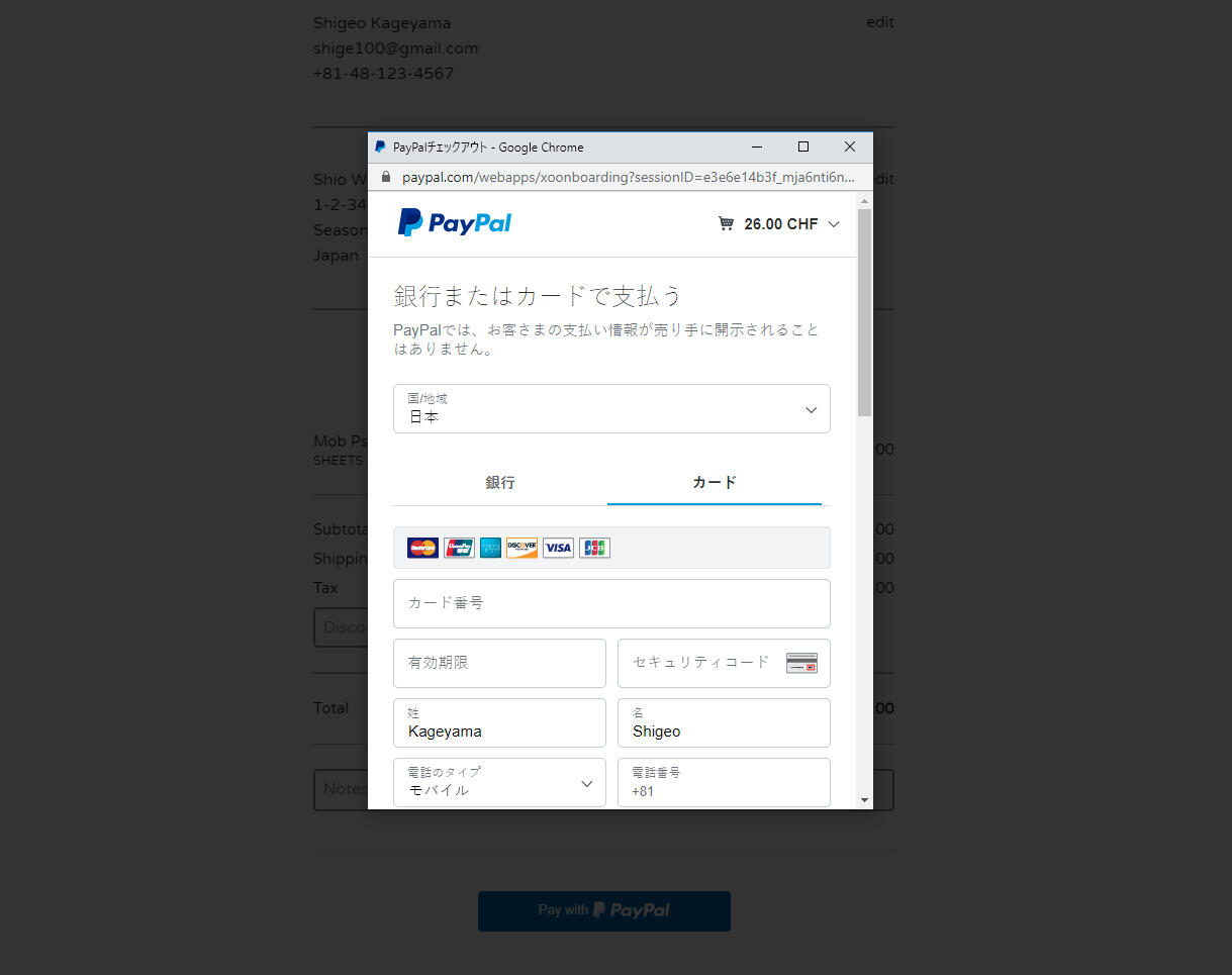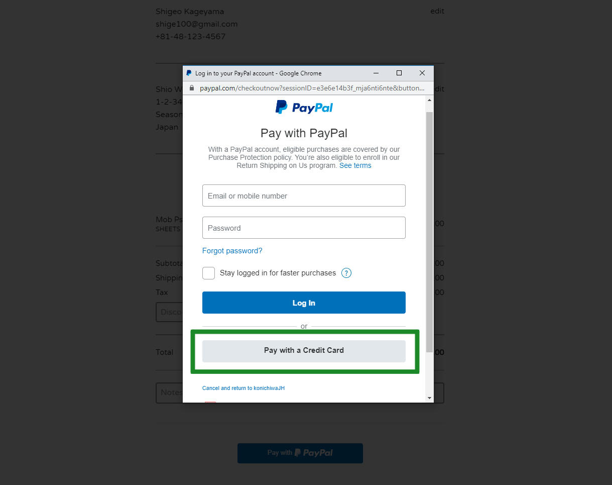 5.「PayPalで支払う」(Pay with PayPal) をクリックします。安全な PayPalブラウザーッデある新しいウインドウが開きます。クレジットカードの場合は、ウィンドウ下部の「クレジットカードでのお支払い」(Pay with a Credit Card) をクリックすると、お住まいの国でご利用可能なクレジットカードでお支払いいただけます。